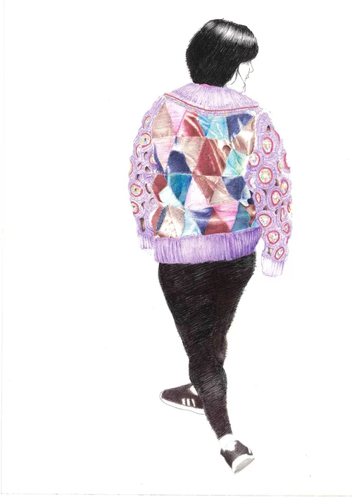 Accompanying drawings mirror the collection, by recreating the artistry of the garments with untraditional poses and a regular woman as the model, inexpensive materials used to create these one-off illustrations that are usually photographed, mass produced for magazines.