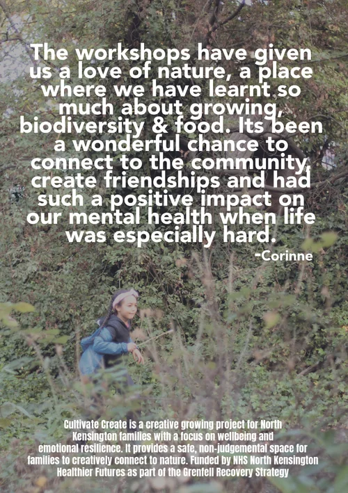 Cultivate Create is a creative growing project for North Kensington families with a focus on wellbeing and emotional resilience. It provides a safe, non-judgmental space for families in which to be creative and connect to nature.